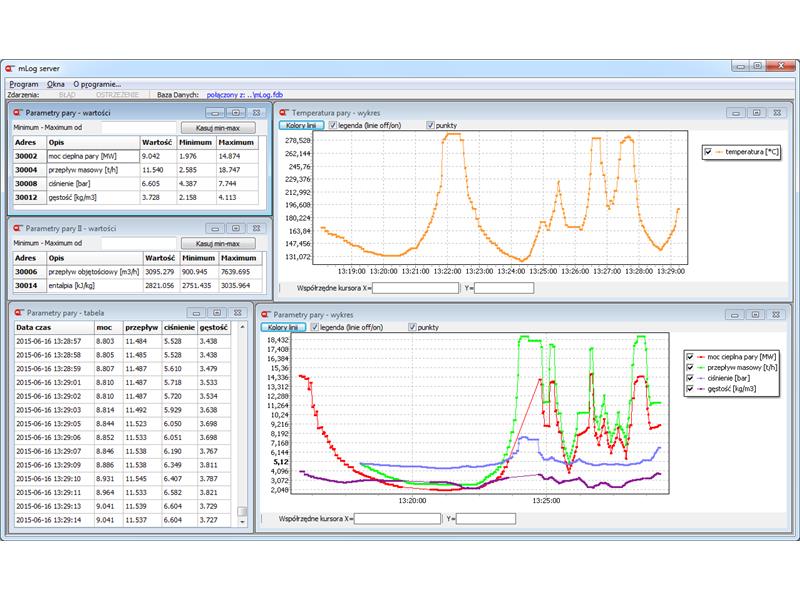 - wizualizację danych on-line w formie wykresów i tabel (mLog server),