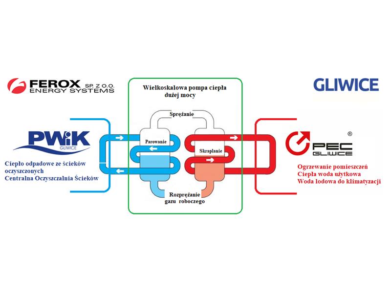 Zastosowana technologia wykorzysta energię odpadową z oczyszczonych ścieków, która zostanie przekształcona w ciepło systemowe zasilające gliwicką sieć ciepłowniczą. Pompa ciepła o układzie dwustopniowego sprężania – oparta na dwóch sprężarkach odśrodkowych współpracujących ze wspólnym ekonomizerem – pozwoli uzyskać wysoką efektywność i temperaturę wody grzewczej sięgającą nawet 90°C.
