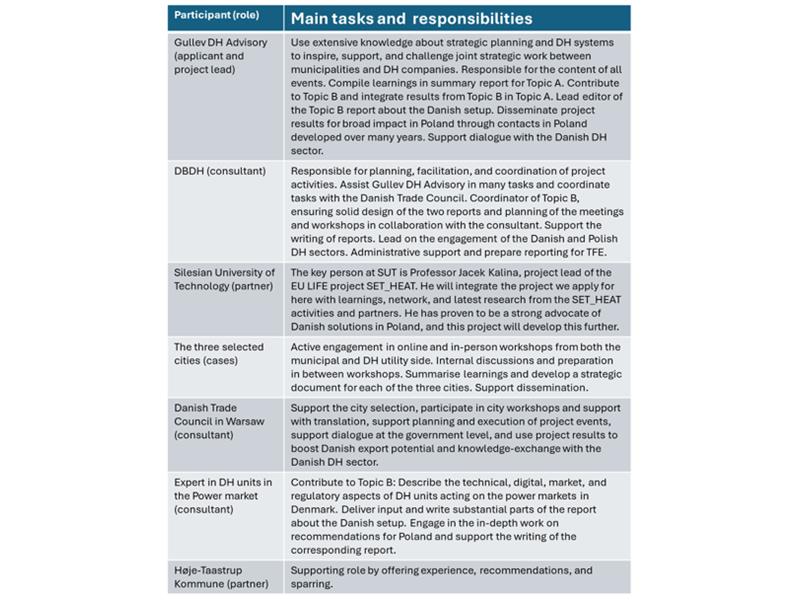- DBDH (konsultant): Duńska organizacja członkowska o międzynarodowej misji tworzenia lepszego świata, w którym ludzie, firmy i miasta czerpią korzyści z zrównoważonej energii lokalnej. Członkami organizacji są przedsiębiorstwa ciepłownicze, konsultanci techniczni i dostawcy technicznych rozwiązań w zakresie ciepłownictwa. Organizacja wydaje magazyn Hot|Cool i posiada rozległą międzynarodową sieć kontaktów. Od dziesięcioleci nieprzerwanie współpracuje z sektorem ciepłowniczym w Polsce, która jest dla DBDH rynkiem priorytetowym. Członek zespołu, Lesia Logvynenko, jest odpowiedzialna za działania DBDH w Polsce. Obejmują one wsparcie projektu TFE Polska 2024-2025, kierowanie projektem finansowanym przez EIFO Green Accelerator, skupiającym się na Polsce, aktywny udział w finansowanym przez UE LIFE projekcie SET_HEAT, w którym Polska jest jednym z czterech głównych krajów, oraz działania eksportowe do i z Polski.
