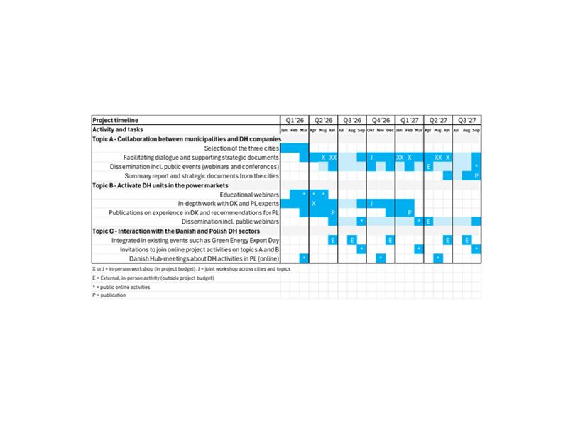 Projekt będzie również (Temat B) wspierał obecne i przyszłe jednostki ciepłownicze w Polsce w aktywnym uczestnictwie w polskich rynkach energii. Zostanie to osiągnięte poprzez dzielenie się wiedzą na temat tego, jak kogeneracja, duże pompy ciepła, kotły elektryczne i magazynowanie ciepła funkcjonują na rynkach energii w zakresie usług dnia następnego, usług śróddziennych i usług pomocni-czych w Danii.